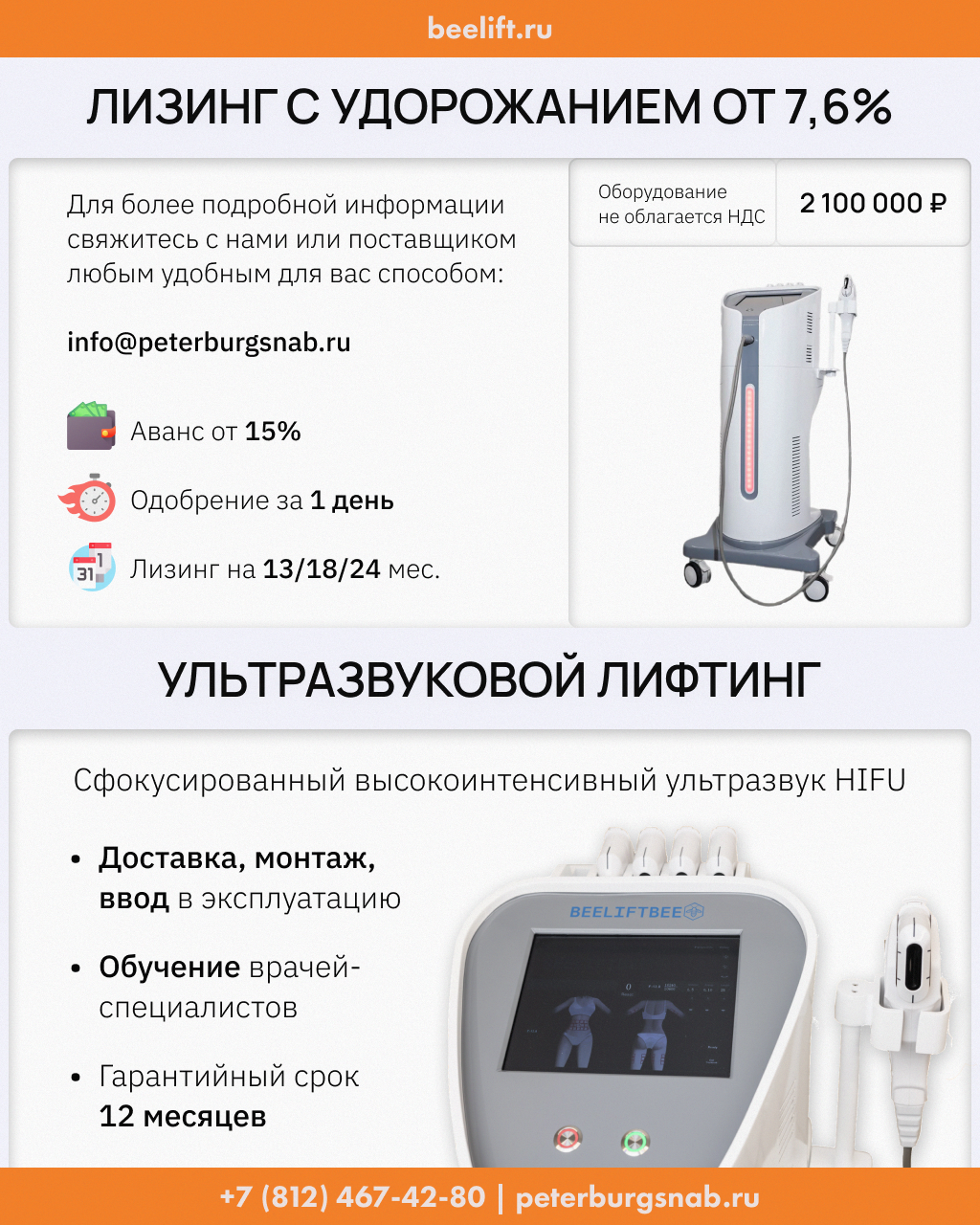 BeeLift — производитель профессиональных систем для ультразвукового лифтинга HIFU. Это оборудование позволяет клиникам и салонам красоты расширить спектр услуг, привлечь новых клиентов и быстро увеличить доход без крупных первоначальных затрат.Условия лизинга